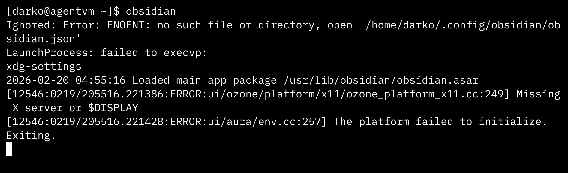 [darko@agentvm ~]$ xvfb-run --auto-servernum obsidian --no-sandbox